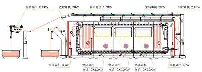 2、主蒸化箱體:主要包括進(jìn)布汽封箱、汽蒸箱頭段和汽蒸箱尾段以及若干個(gè)中段(每個(gè)中段容布量70m:兩個(gè)循環(huán)風(fēng)機(jī)、兩個(gè)熱交換器、兩套蒸汽加濕噴嘴等)、帶蒸汽加熱的頂部、底部輔助加熱管、帶照明的觀察窗、成環(huán)進(jìn)布輥、成環(huán)機(jī)構(gòu)、鏈條軌道、掛布輥軌道、掛布輥、主傳動(dòng)、帶容布量探測器的出布調(diào)整裝置、出布汽封箱、離心排風(fēng)機(jī)等。